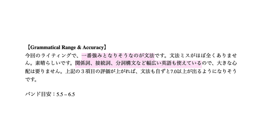 さらに、課題だけでなく「文法ミスが少ない」「接続詞や関係詞の使い方は安定している」といった強みも評価され、自分の良い部分と改善すべき点をバランスよく把握できました。