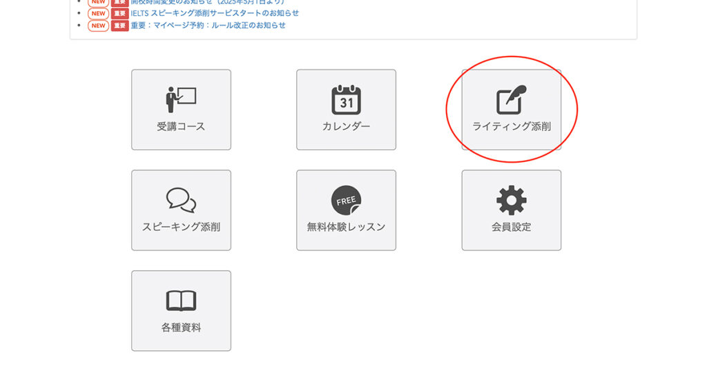 会員登録が完了すると、マイページの「ライティング添削購入ボタン」からサービスの購入が可能です。