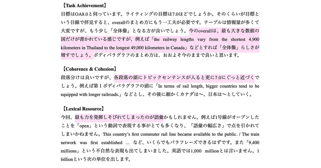 返却された添削レポートには、修正点だけでなく、IELTSの4つの評価基準に沿った具体的な指摘とコメントが含まれていました。