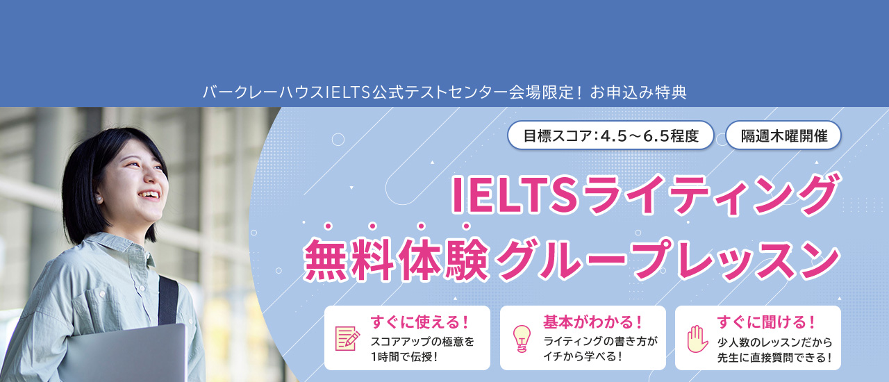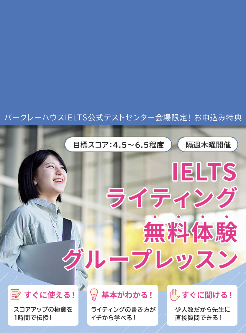 IELTSの目標スコアにどうしても届かない、目標スコア提出まで時間が無い、中々スコアがアップしないなど、 IELTS 対策が必要な方へバークレーハウス IELTS公式テストセンターの関連会社「バークレーハウス」では、 IELTS満点講師による IELTS 対策講座を提供しています。