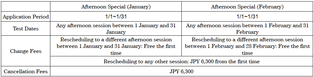 If you apply for an afternoon session on an January test date between 1 January and 31 January, you will get a JPY 500 discount!