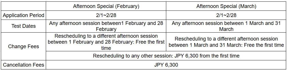 If you apply for an afternoon session on an March test date between 1 February and 28 February, you will get a JPY 500 discount!