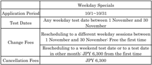 If you apply for a weekday session on an November test date between 1 October and 31 October, you will get a JPY 500 discount!