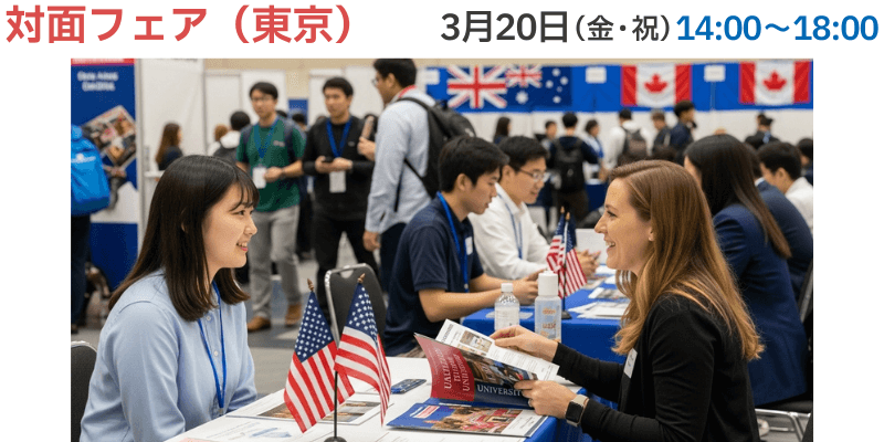 本フェアでは、大学や教育機関の担当者と直接話すことができ、海外留学の計画に必要な情報をまとめてゲットすることができます。コース内容、出願方法、学費、奨学金などについて、詳しくご相談ください。