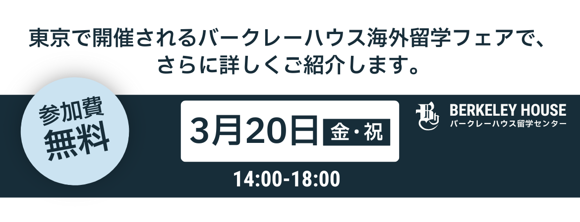 東京留学フェア 日時:2026年3月20日(金)14:00〜18:00 場所:東京・AP市ヶ谷 〒102-0076 東京都千代田区五番町1-10 市ヶ谷大郷ビル 6F 参加費:無料 何かご不明な点がございましたらお気軽にお問い合わせください。 overseas.study@berkeleyhouse.co.jp