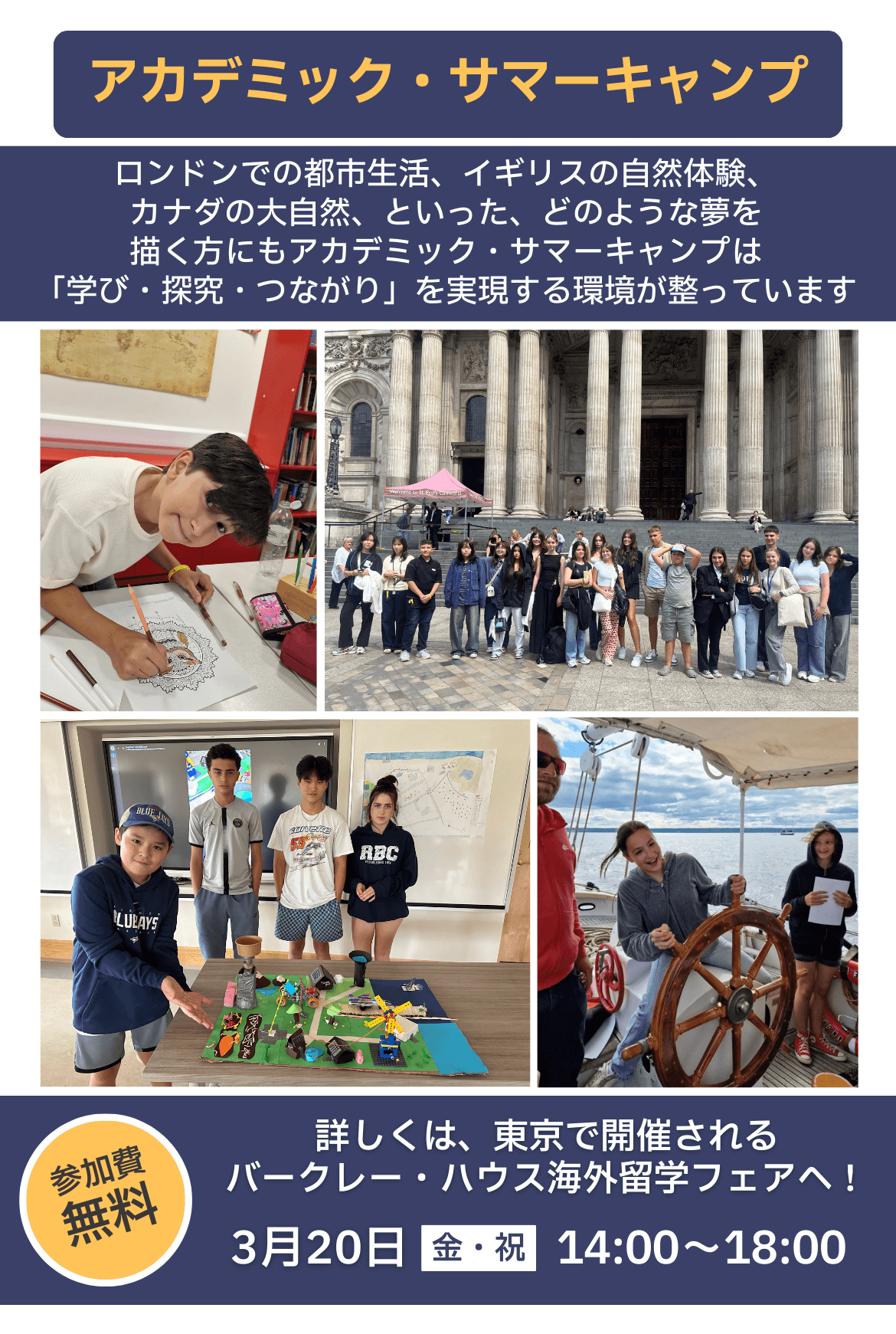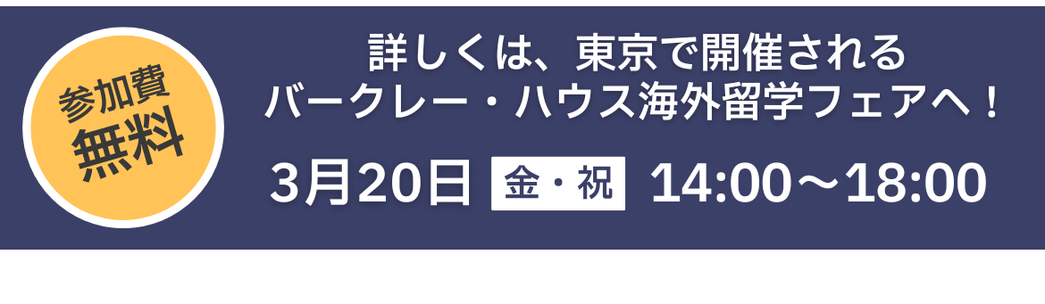 東京留学フェア 日時:2026年3月20日(金)14:00〜18:00 場所:東京・AP市ヶ谷 〒102-0076 東京都千代田区五番町1-10 市ヶ谷大郷ビル 6F 参加費:無料 何かご不明な点がございましたらお気軽にお問い合わせください。 overseas.study@berkeleyhouse.co.jp