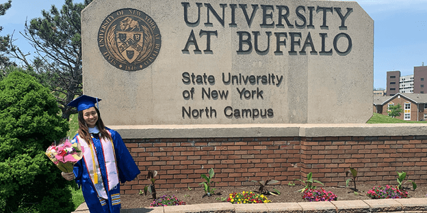 鈴木さくらさんはニューヨーク州立大学バッファロー校(UB)心理学学士課程 最終学年の学生。SIMで国際ビジネスのディプロマを修了後、UB学士課程の2年次に編入しました。アメリカの学位を取得することは、さくらさんにとって長年の夢でした。